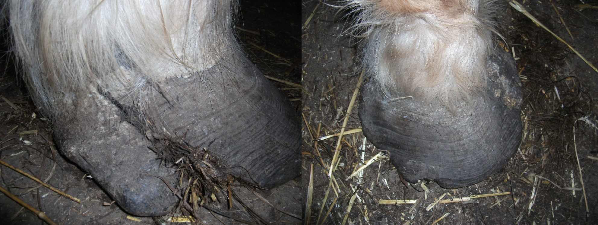 A megnövekedett szaru és az elhanyagoltságnak köszönhetően a paták belső szárán kb 15 cm hosszú, 4 cm átmérőjű szaruréteg kiszakadt, a pata a sarokvánkosokig el van repedve, a baktériumok behatására a csüd és környékén erősen sömörös.
